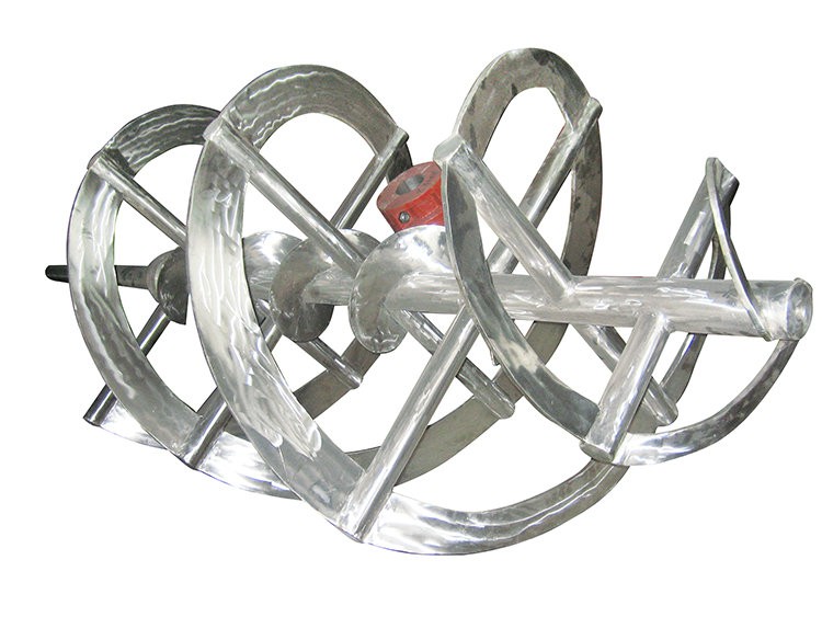 低速型槳,循環優良型槳,高粘度型槳,軸向流槳。物料沿著螺旋面上升或下降形成軸向的上下循環。一般是近罐壁上升,中軸匯合下壓。適用于高粘度介質的傳熱、混合、溶解反應等過程。此類攪拌器應用于特高粘度介質攪拌。桿螺帶(俗稱螺桿)是螺帶的特殊型式,直徑小沿軸引成螺帶與外螺帶配合應用時方向相反可強化軸向循環。